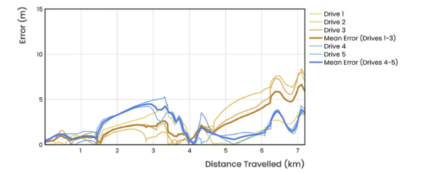 To validate the accuracy and resilience of the LVS Hybrid system, Advanced Navigation conducted a series of rigorous real-world driving tests. Across five trials, the system delivered exceptional performance with an average error per distance traveled of 0.053% compared to a GNSS (Global Navigation Satellite System) reference.