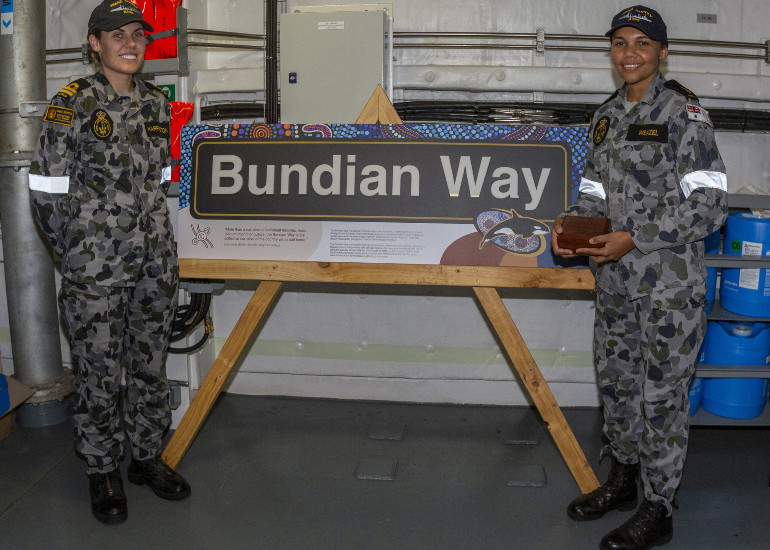 The crew of NUSHIP Supply, with Les Kosez from Eden Aboriginal Land Council, has officially unveiled the main passageway sign inside Navy’s newest ship. This is a lasting symbol of the effort to lead The Royal Australian Navy in Indigenous cultural integration. With approval from Eden Aboriginal Land Council, NUSHIP Supply installed the ‘Bundian Way’ sign, named after an historic Aboriginal passageway in the ship’s ceremonial homeport of Eden.